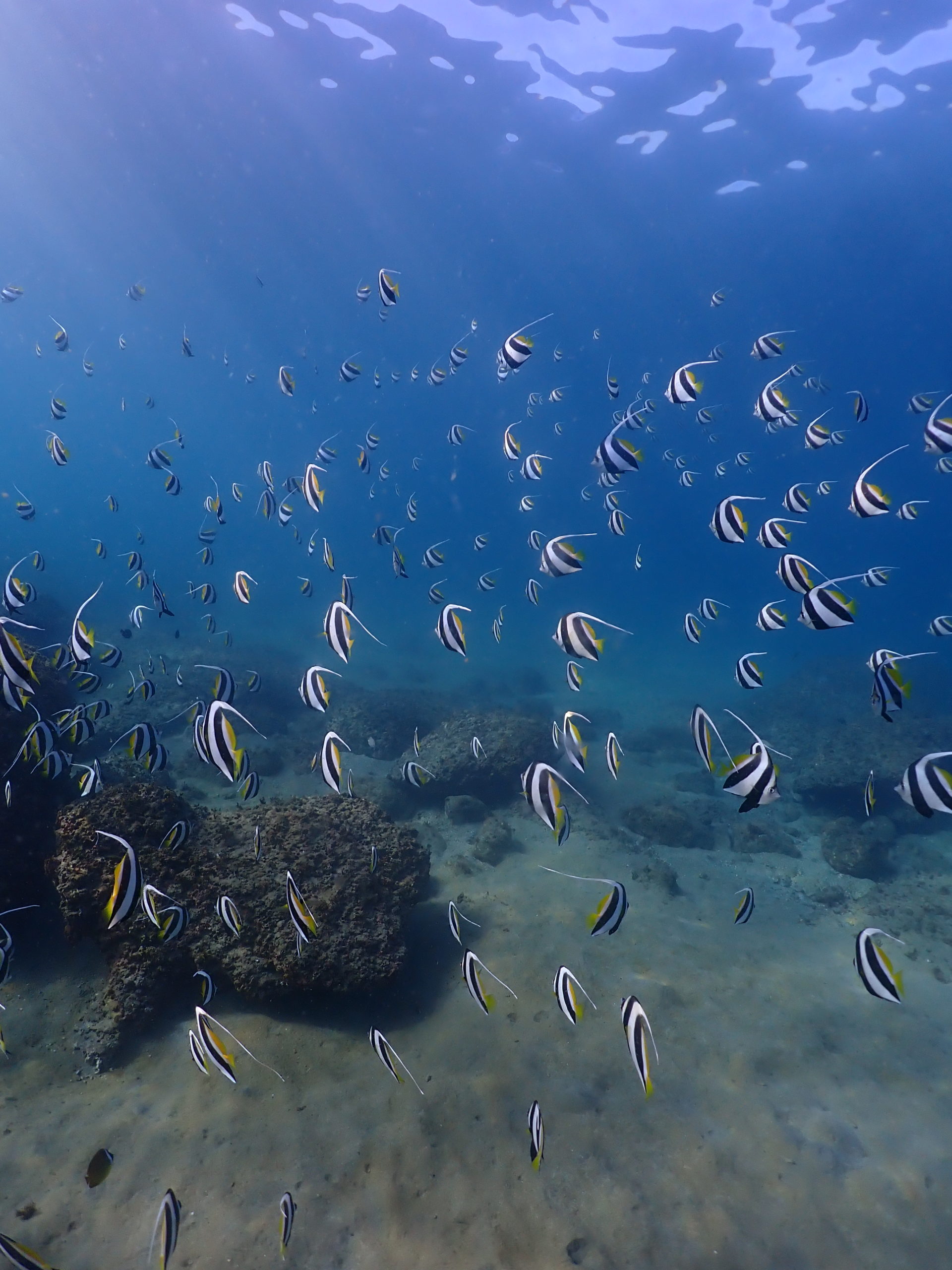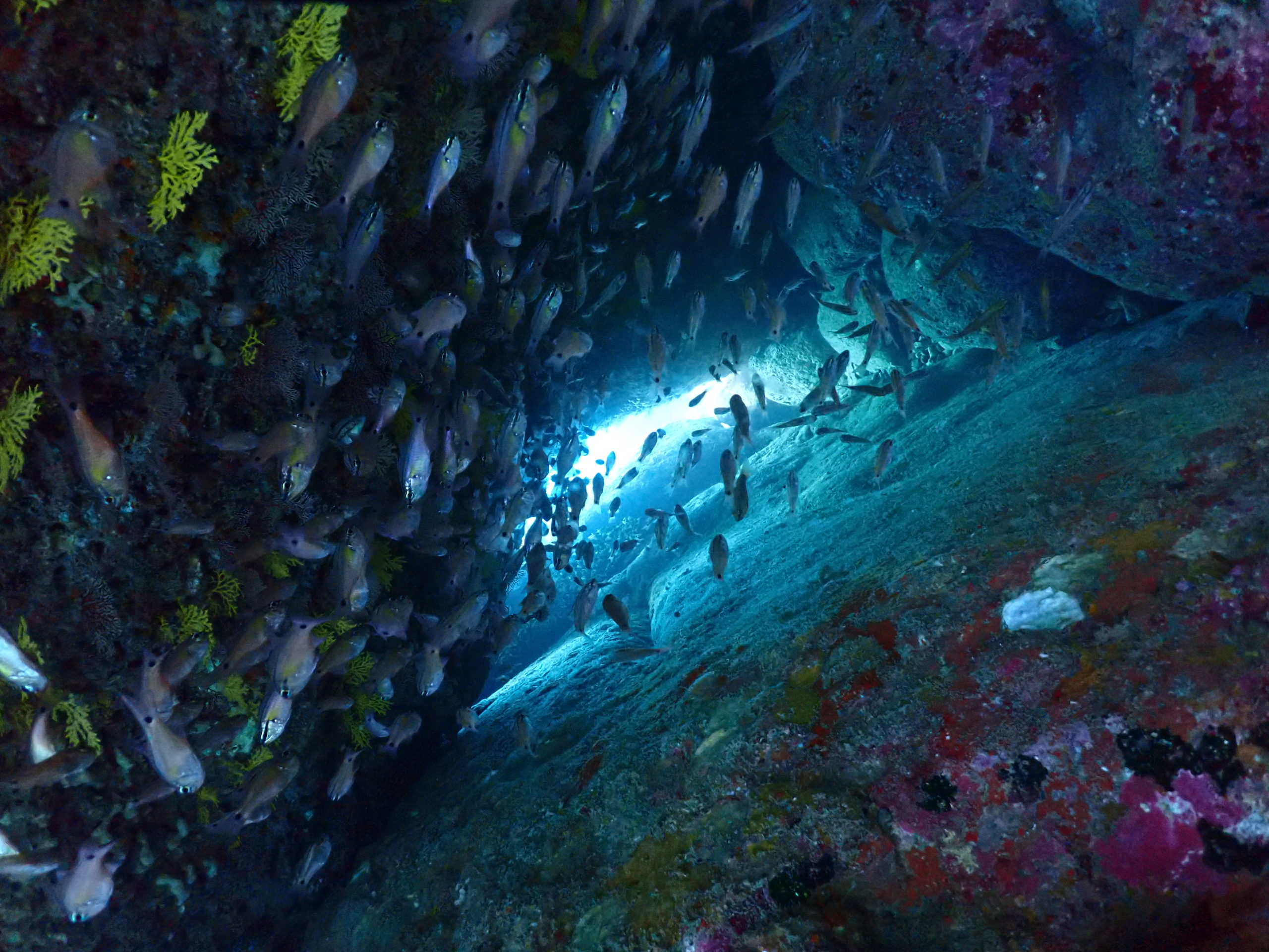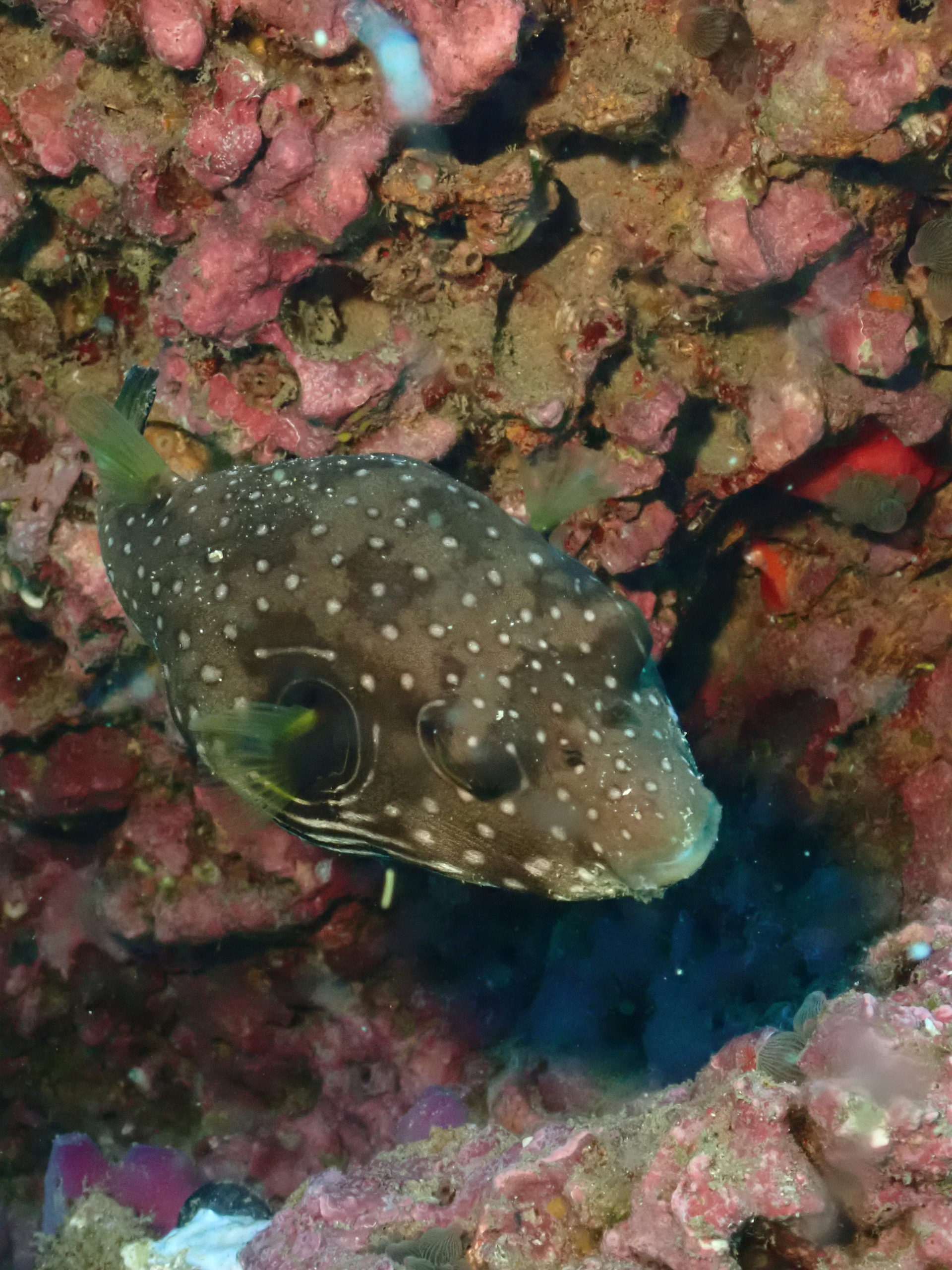 2025-11-18 【和歌山・白崎】海はキレイが保っています♪ 本日の海は、台風並みに大荒れで海はクローズとなりました・・・ 昨日は問題なくえんとりーでき、海も青くてキレイで、水温も快適な海でしたー! ハブガタとロックへ ハブガタは相変わらず、ハタタテダイが群れ、南国雰囲気が漂っています♪ 今回もサザナミフグが見ることができ、うれしい限りです☆ ロックでは、岩の隙間に群れているネンブツダイや、中層のスズメダイ群れ、イワシ群れなど観察できました。 ウミウシはこれからかな。 水温23℃、透明度15m